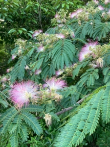 愉快な仲間たちが、ネムノキ(合歓の木、英語ではsilk tree)の写真を送ってくれました。ネムノキは、水鳥の産毛のようなふわふわとした花と、夜になると葉を眠るように閉じる就眠運動が特徴です。花言葉は「歓喜」「胸のときめき」「夢想」「安らぎ」です。
