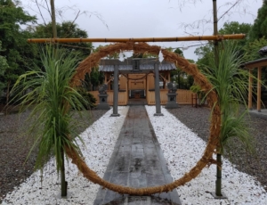 茅の輪くぐりとは、参道の鳥居などの結界内に、茅(チガヤ)という草で編んだ直径数メートルの輪を作り、これをくぐることで心身を清めて災厄を祓い、無病息災を祈願するというものです。日本神話のスサノオノミコトに由来すると言われ、唱え詞を唱えながら8の字に3度くぐり抜けます。私も、唱え詞を唱えながら、最後には「蘇民将来(ソミンショウライ) 蘇民将来」という詞で締めました。