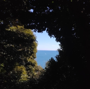 伊射波神社の奇跡の窓を見て、私の心の窓はどのくらい開いているのだろうかと考えてみました。木々の緑の間から青く輝く海のような景色を、私の心は見ているのだろうか?と疑問に思ったのです。