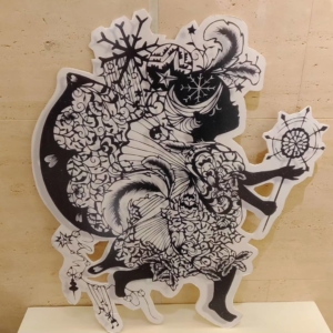 この写真は、切り絵作家・蒼山日菜さんの作品です。神戸ファッション美術館で開催されている『日本の切り絵 7人のミューズ』という展覧会の入場口前に「わたしといっしょに写真をとってね♪」と置かれていたものです。とても細かい切り絵でしょう。蒼山さんはこの作品をハサミ一本で製作しています。