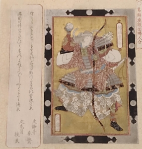 そういえば、神功皇后も男装をして軍を率い、60年以上も国を統治した女帝であると戦前までは認識されていました。この写真は、大和文華館で開催されている「レスコヴィッチコレクションの摺物~パリから来た北斎・広重・北渓・岳亭~」で展示されている神功皇后の摺物(作者は岳亭春信)です。大鎧を身にまとい、腰には大刀、背丈ほどの長さの大弓を持った勇ましい姿です。