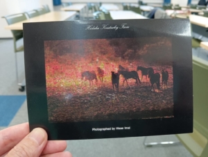 この写真は、フォーカシングの研修を受けたときに、私が選んだ絵葉書です。200枚をこえる絵葉書が机の上に並べられ、その中から気になったものを選ぶというワークでした。たくさんの選択肢の中から選ぶという作業は、私にとっては一瞬で決まることが多いです。ざ~っと200枚を目で追いながら、「これ!」と瞬時に選び取ります。